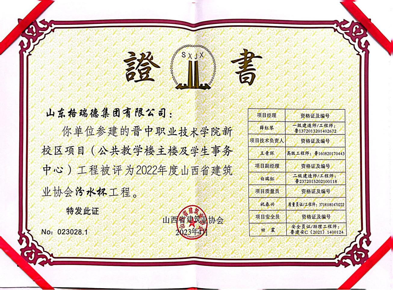 由山西省建筑業協會下發《關于公布2022年度及2021年度(省外工程)山西省建筑業協會汾水杯工程評價名單的通知》文件中,山東格瑞德集團有限公司承攬“晉中職業技術學院新校區項目(公共教學樓主樓及學生事務中心)”工程被評為2022年度山西省建筑業協會汾水杯工程。