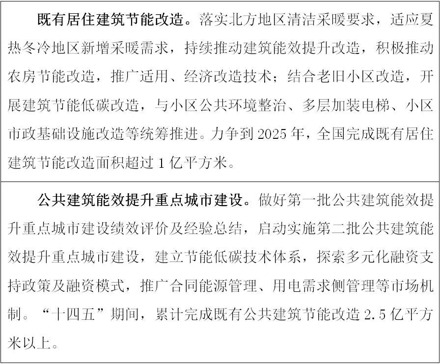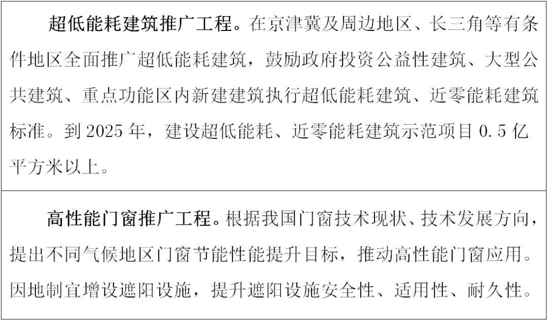 以《建筑節能與可再生能源利用通用規范》確定的節能指標要求為基線,啟動實施我國新建民用建筑能效“小步快跑”提升計劃,分階段、分類型、分氣候區提高城鎮新建民用建筑節能強制性標準,重點提高建筑門窗等關鍵部品節能性能要求,推廣地區適應性強、防火等級高、保溫隔熱性能好的建筑保溫隔熱系統。推動政府投資公益性建筑和大型公共建筑提高節能標準,嚴格管控高耗能公共建筑建設。引導京津冀、長三角等重點區域制定更高水平節能標準,開展超低能耗建筑規模化建設,推動零碳建筑、零碳社區建設試點。在其他地區開展超低能耗建筑、近零能耗建筑、零碳建筑建設示范。推動農房和農村公共建筑執行有關標準,推廣適宜節能技術,建成一批超低能耗農房試點示范項目,提升農村建筑能源利用效率,改善室內熱舒適環境。