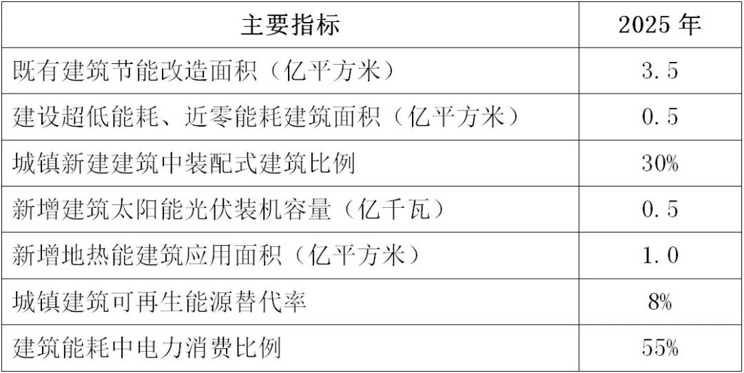 2.具體目標。到2025年,完成既有建筑節能改造面積3.5億平方米以上,建設超低能耗、近零能耗建筑0.5億平方米以上,裝配式建筑占當年城鎮新建建筑的比例達到30%,全國新增建筑太陽能光伏裝機容量0.5億千瓦以上,地熱能建筑應用面積1億平方米以上,城鎮建筑可再生能源替代率達到8%,建筑能耗中電力消費比例超過55%。