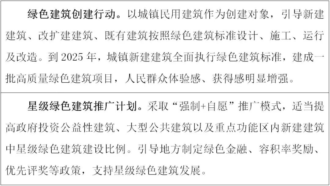 1.加強高品質綠色建筑建設。推進綠色建筑標準實施,加強規劃、設計、施工和運行管理。倡導建筑綠色低碳設計理念,充分利用自然通風、天然采光等,降低住宅用能強度,提高住宅健康性能。推動有條件地區政府投資公益性建筑、大型公共建筑等新建建筑全部建成星級綠色建筑。引導地方制定支持政策,推動綠色建筑規模化發展,鼓勵建設高星級綠色建筑。降低工程質量通病發生率,提高綠色建筑工程質量。開展綠色農房建設試點。