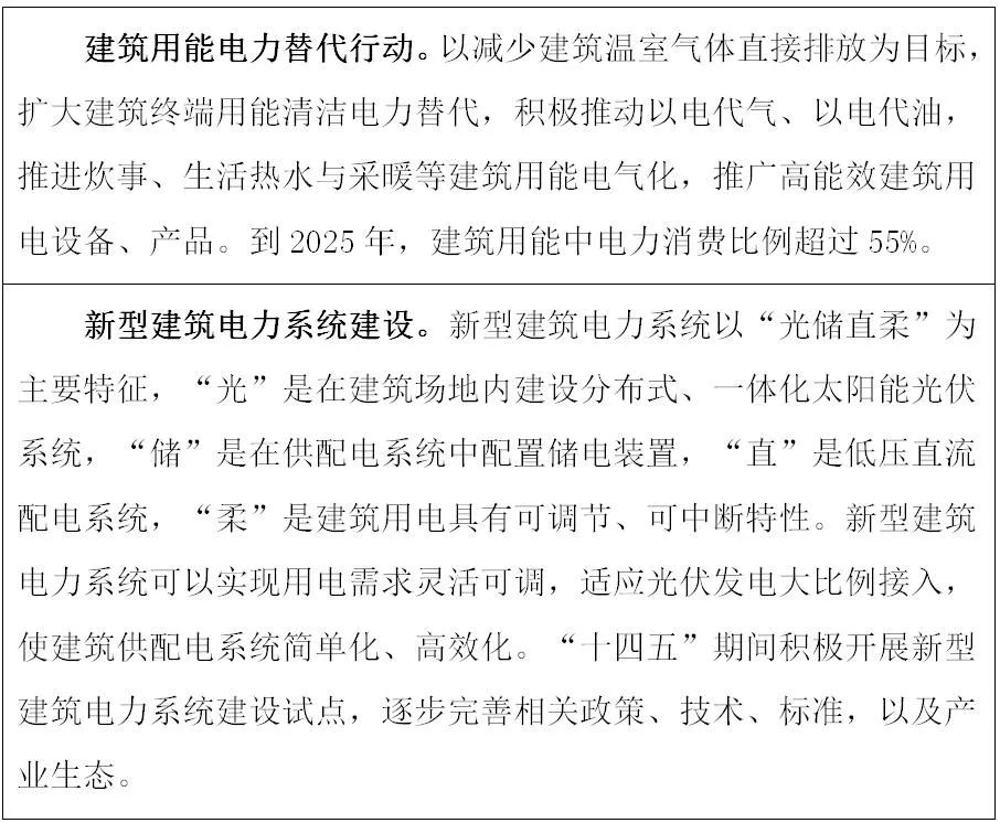 充分發揮電力在建筑終端消費清潔性、可獲得性、便利性等優勢,建立以電力消費為核心的建筑能源消費體系。夏熱冬冷地區積極采用熱泵等電采暖方式解決新增采暖需求。開展新建公共建筑全電氣化設計試點示范。在城市大型商場、辦公樓、酒店、機場航站樓等建筑中推廣應用熱泵、電蓄冷空調、蓄熱電鍋爐。引導生活熱水、炊事用能向電氣化發展,促進高效電氣化技術與設備研發應用。鼓勵建設以“光儲直柔”為特征的新型建筑電力系統,發展柔性用電建筑。