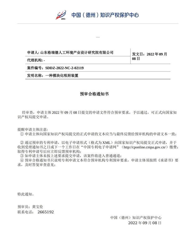 該專利是中國(德州)知識產權保護中心開展快速預審服務以來集團首件獲得國家授權的專利,標志著集團在自主創新之路上實現了“格瑞德速度”。預審合格后,8月31日該專利申請被正式提交至國家知識產權局,9月8日即獲得授權。與一般實用新型專利常規審查程序所需的8個月左右相比,授權周期大幅縮減。格瑞德人工環境產業設計研究院近日提交的“一種模塊化吸附裝置”專利文件,也已順利通過保護中心預審,進入國家專利局快速審查通道。本月還將有兩項發明專利通過保護中心快速預審平臺提交,為集團知識產權快速確權提供新引擎。