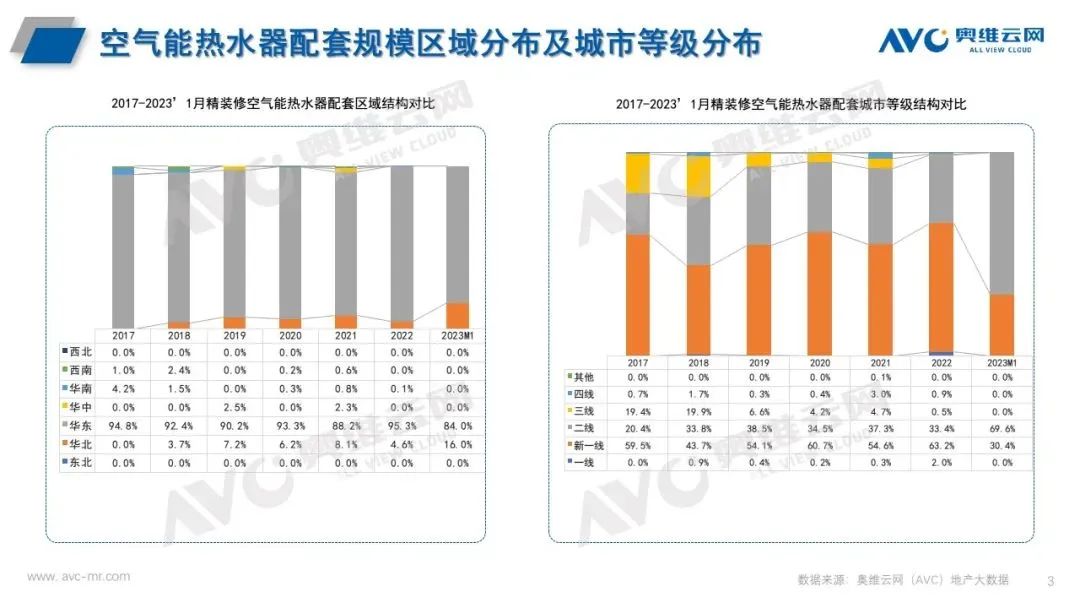 從近年空氣能熱水器市場來看,近年來空氣能熱水器主力戰場始終是華東區。從近年城市等級分布來看,空氣能熱水器集中分布在新一線城市和二線城市中,合計份額均在七成以上,從單個城市來看,近年來空氣能熱水器重點城市主要為杭州,寧波、紹興、溫州等,從開發商陣營來看,近年來空氣能熱水器配套中,TOP50開發商市場份額均超八成,其中TOP10開發商市場份額均為40%以上, 2023年1月精裝修市場空氣能熱水器配套均分布在TOP10開發商中。