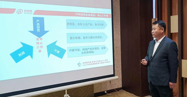 3月2日,格瑞德集團銷售中心湖北分公司在武漢華天大酒店會議室召開湖北分公司2022年度股東會及2023年度客戶聯誼會。集團執行總裁管志廣、南方大區總經理曹大軍參與會議,本次會議主要就湖北分公司2022年度經營情況及未來發展方向進行匯報交流,與業務經理深入交流,推廣合作模式,拓寬合作渠道,開拓銷售市場。