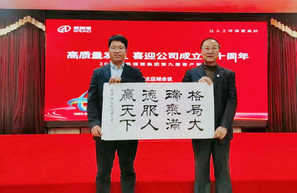 會議最后,南方大區總經理曹大軍和湖北分公司總經理張文橋進行年初責任狀簽字儀式,集團執行總裁管志廣授旗,湖北分公司總經理張文橋帶領湖北分公司全體員工進行出征宣誓,湖北省制冷協會秘書長張定國贈予墨寶藏頭詩賀詞,本次客戶聯誼會圓滿結束。