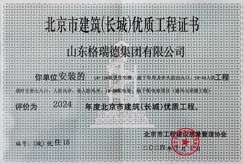 近日,由北京市工程建設資料管理協會下發《關于公示 2024 年度北京市建筑(長城)優質工程名單的通知》。其中山東格瑞德集團有限公司承攬的“ 1#-12#租賃住宅樓、地下車庫及非人防出入口、1#-6#人防戰時主要出入口、人防風井、非人防風井、1#-2#配電室、地下配電室項目(通風與采暖工程)工程 ”評為2024年度北京市建筑(長城)優質工程。