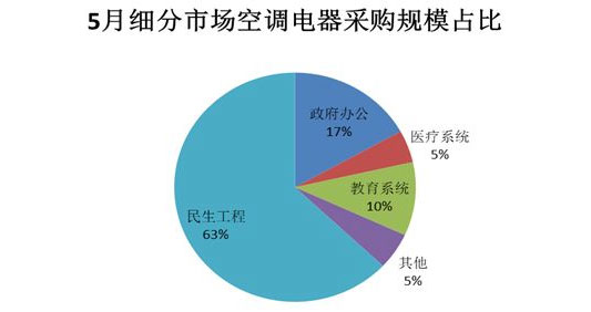 5月,政府機(jī)關(guān)空調(diào)采購(gòu)金額達(dá)3.26億元,占比17%。為了凸顯規(guī)模效應(yīng),空調(diào)批采已成為越來(lái)越多政府機(jī)關(guān)民用空調(diào)采購(gòu)首選。批采通過(guò)匯總采購(gòu)人實(shí)際需求從而形成規(guī)模效應(yīng),讓競(jìng)爭(zhēng)更加充分,既體現(xiàn)公平公正,也最大限度地節(jié)約財(cái)政資金。5月,空調(diào)批采千萬(wàn)元大項(xiàng)目主要聚集在廣東,吸引主流空調(diào)廠家積極參與。此外,隨著酷熱天氣臨近,不少采購(gòu)單位把空調(diào)維修保養(yǎng)擺上重要議事日程。以北京為例,5月中央空調(diào)維修更新項(xiàng)目近十個(gè),其中北京市公安局本級(jí)行政四個(gè)項(xiàng)目密集開(kāi)標(biāo),包括北京市公安局直屬單位2017年中央空調(diào)維修更新項(xiàng)目等。