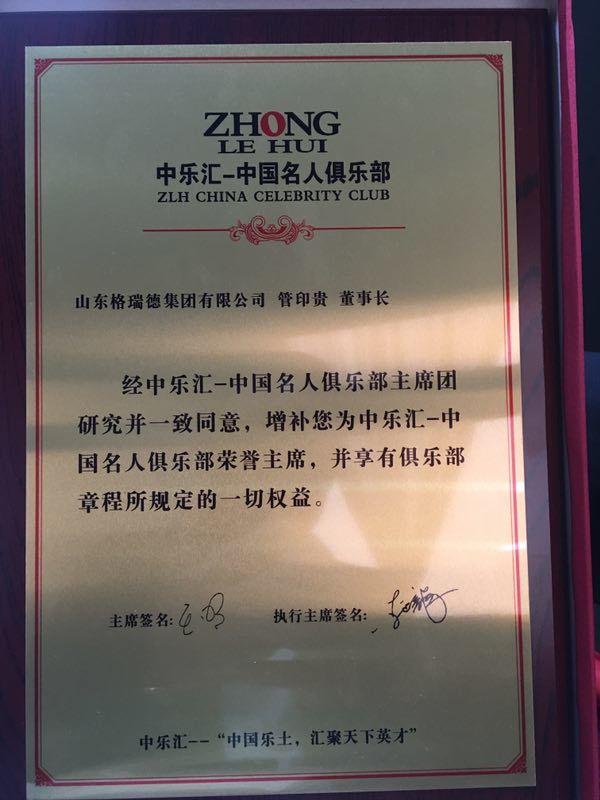 管印貴董事長被中樂匯·中國名人俱樂部授予“榮譽主席”的職位。