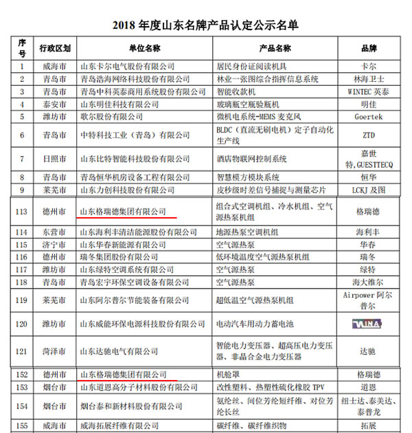 近日,從山東省質量評價協會官網發布的《關于公示2018年度山東名牌產品和山東省服務名牌擬認定名單的公告》中獲悉,集團生產的組合式空調機組、冷水機組、空氣源熱泵機組、機艙罩被認定為2018年度“山東名牌”產品。